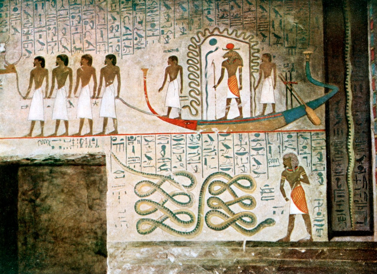 transport · transportation · animal · people · religious · boat · boats · arts · country · egypt · religion · reptile · snake · writing · costume · sheep · color · colour · egyptian · death · tomb · dress · deity · mausoleum · mural · location · luxor · hieroglyphics · karnak · burial · concept · language · serpent · goddess · hieroglyphic · water transport · ancient egyptian · ancient egypt · new kingdom · thebes · art media · as said · khnum · tgn · tombs of the nobles · unknown · Art Media/Heritage Images |