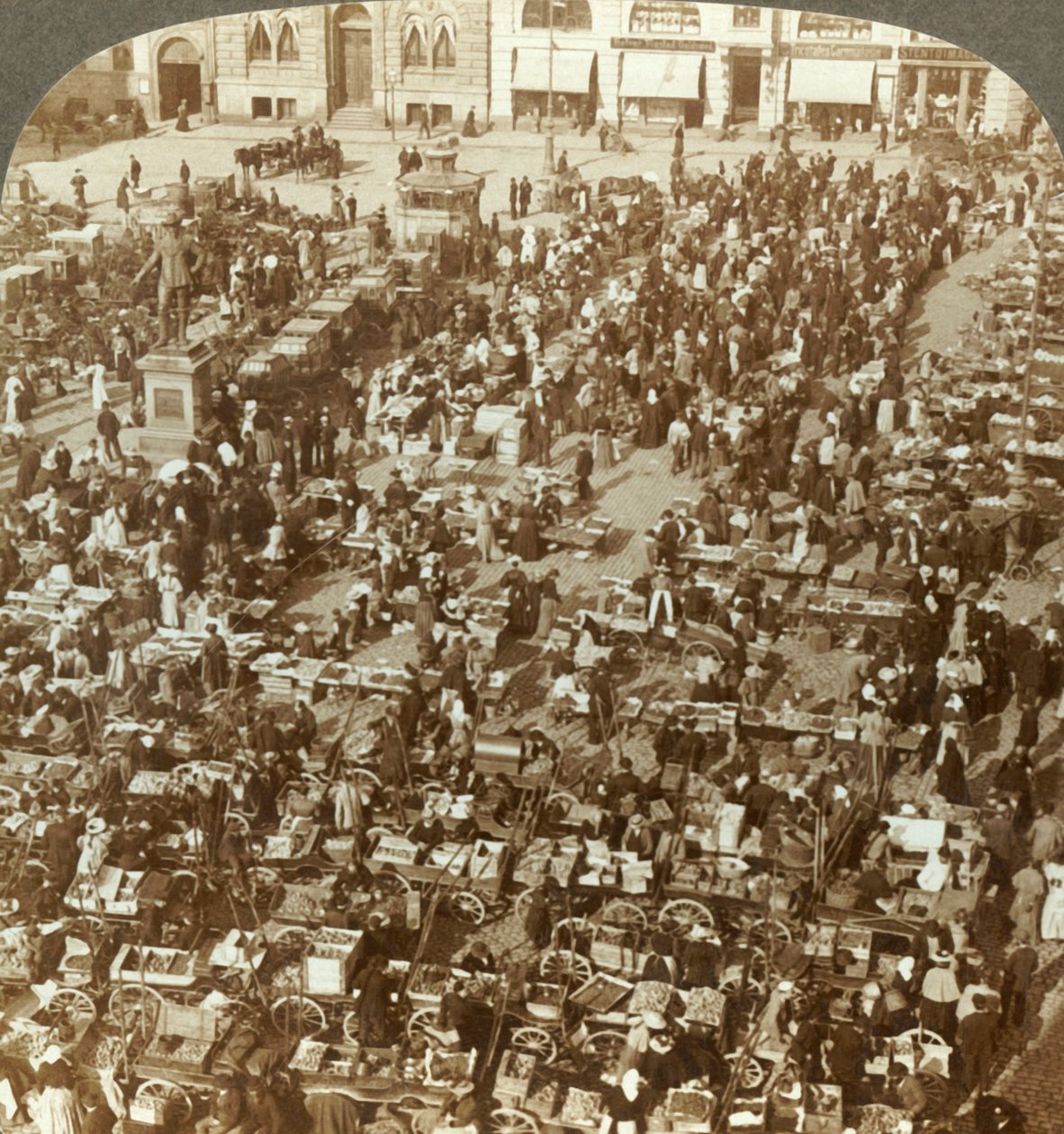 europe · city · female · women · woman · people · male · busy · country · market · trade · norway · norwegian · view · crowded · market stall · location · century · customer · vista · vintage · lady · concept · oslo · capital city · monochrome · black white · black and white · elevated view · 1900s · 20th century · market place · stereoscopic · photograph · stereoscopic card · stereocard · unknown · arial view · underwood underwood · christiania · stereoscope card · underwood travel library · The Print Collector/Heritage Images |