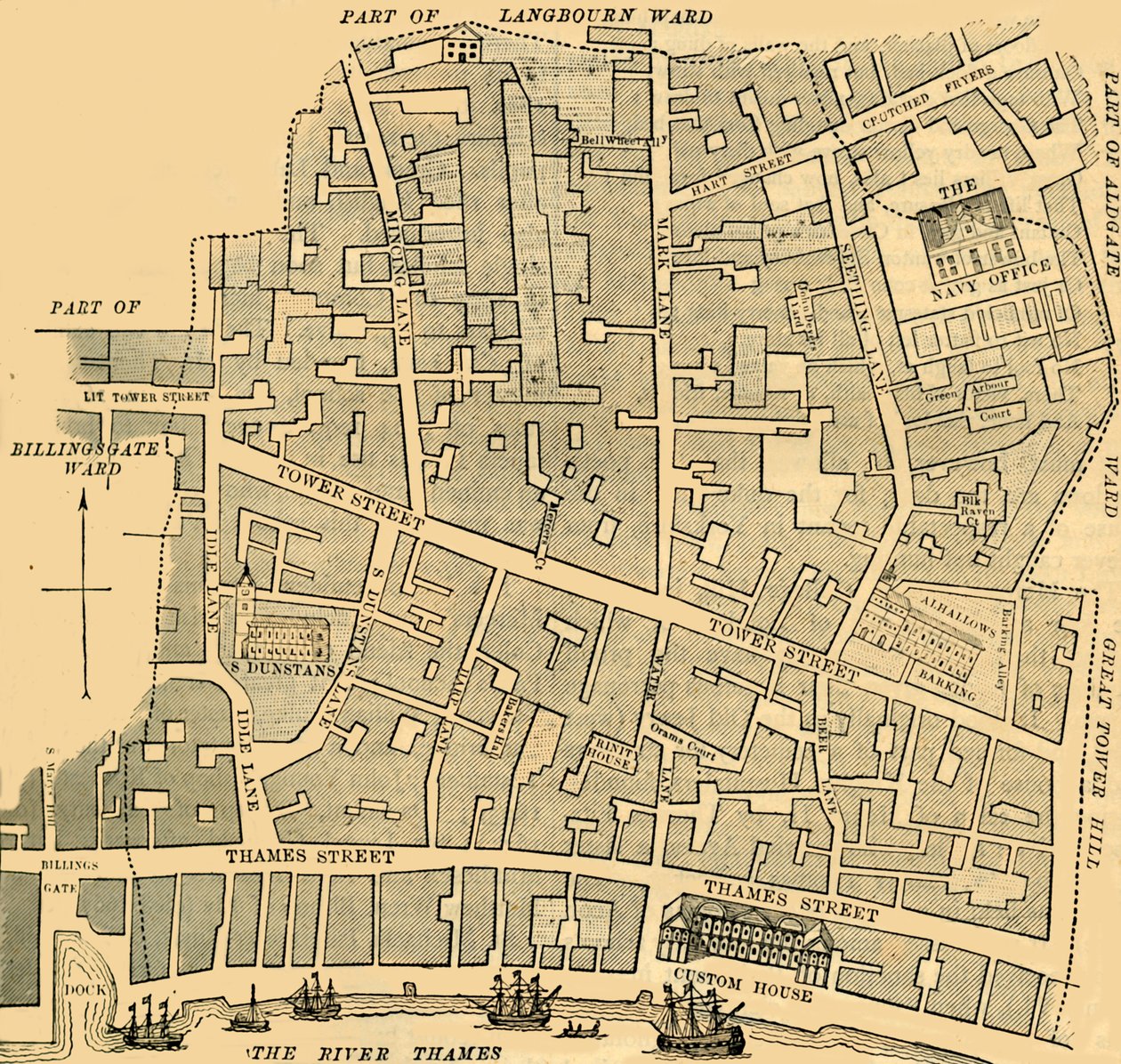 transport · transportation · city · river · road · london · england · river thames · thames · street · town · country · finance · trade · port · ship · ships · occupation · british · geography · english · lane · avenue · location · century · city of london · britain · profession · ward · monochrome · sailing ship · sailing ships · publication · 19th century · water transport · black white · black and white · publisher · custom house · nineteenth century · geographical feature · port of london authority · street plan · thames street · tower street · old and new london · cassell · unknown · thornbury · cassell company ltd · george walter thornbury · george walter · petter · galpin co · galpin company · The Print Collector/Heritage Images |