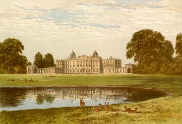 nature · exterior · animal · water · tree · building · buildings · england · people · house · architecture · garden · plant · arts · country · lake · british · geography · english · color · colour · deer · royal · location · century · britain · royalty · outside · gloucestershire · country house · stately home · 19th century · duke · aristocracy · aristocrat · 18th century · eighteenth century · nineteenth century · duke of beaufort · geographical feature · palladian · palladianism · engraving · unknown · badminton house · william · william kent · kent · benjamin fawcett · fawcett · benjamin · af lydon · lydon · alexander francis lydon · alexander lydon · The Print Collector/Heritage Images