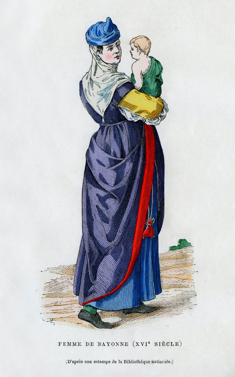 female · carrying · women · woman · people · child · children · walking · baby · babies · country · french · france · costume · color · colour · aquitaine · dress · location · century · lady · basque · rambling · basque country · pyrenees-atlantiques · bayonne · 16th century · sixteenth century · engraving · portrait · unknown · pyrénées-atlantiques · The Print Collector/Heritage Images |