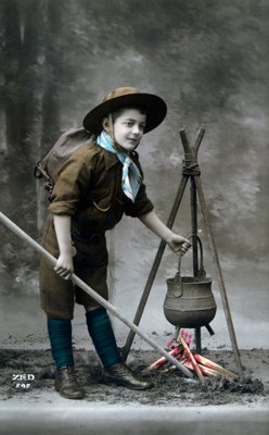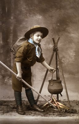 exterior · holding · people · male · boys · communications · home · country · french · france · media · burning · campfire · fire · clothes · color · colour · support · uniform · dress · military · text · location · century · stick · vintage · postcard · print · first world war · concept · outside · hand-tinted · scout · scouts · world war i · postal service · world war one · 20th century · art media · 1st world war · cauldron · cauldron hanger · propoganda · hand coloured · portrait · postcard · unknown · Art Media/Heritage Images
