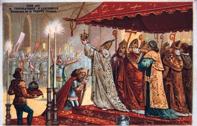 people · male · event · religious · religion · candle · candles · emperor · monarch · card · church · color · colour · king · royal · christianity · canopy · kneeling · century · royalty · crown · priest · bishop · collectible · 19th century · nineteenth century · art media · 8th century · coronation · royal event · sovereign · pope leo iii · charles i · charlemagne · chromolithograph · unknown · saint · carlomagno · karl der grosse · emperor charlemagne · charles the great · charles le grand · carolus magnus · leo iii · saint leo · st leo · leo · Art Media/Heritage Images