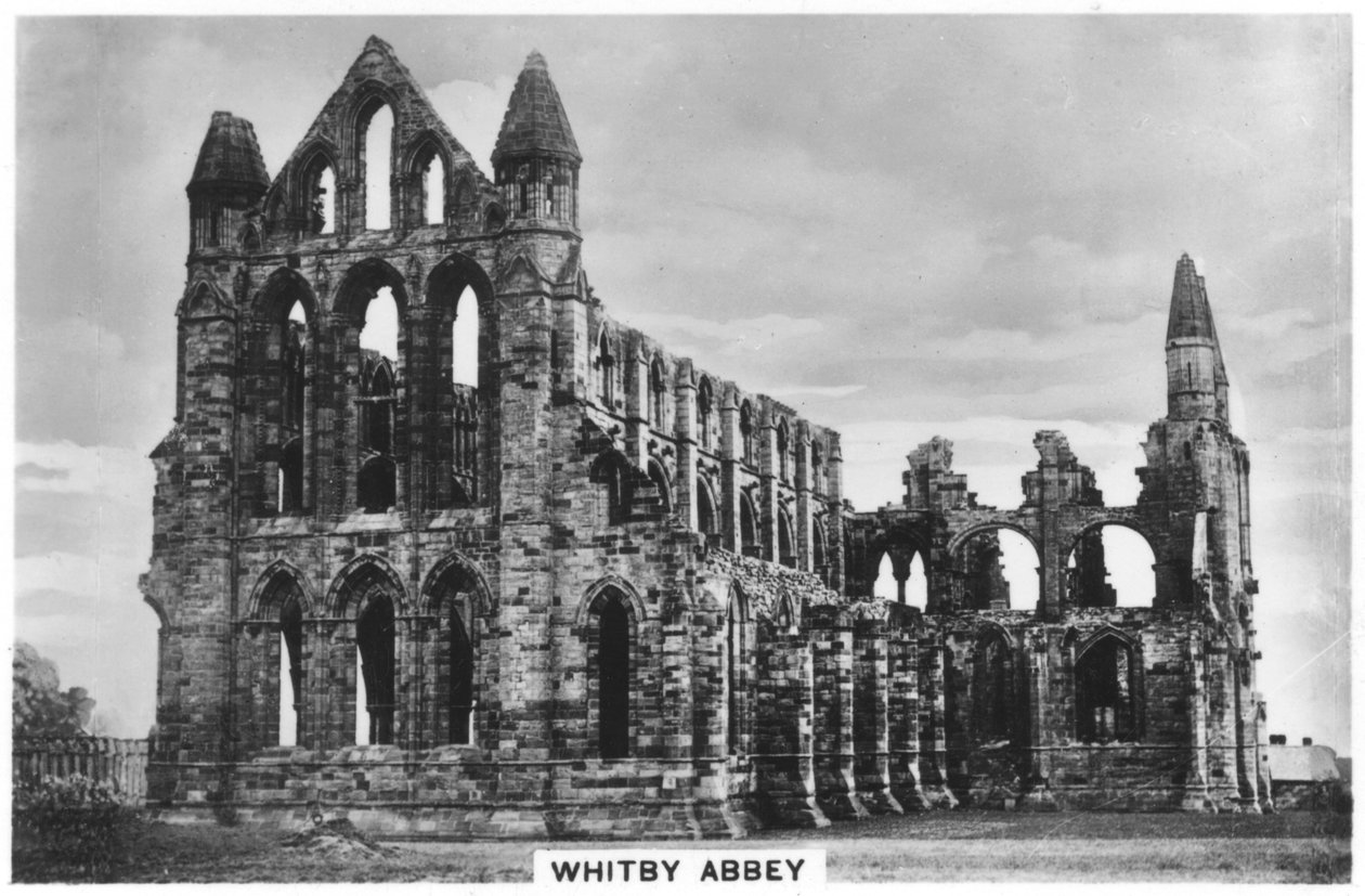 exterior · england · religious · architecture · religion · british · ruins · ruin · century · britain · photograph · thirties · abbey · concept · outside · ruined · whitby · north yorkshire · whitby abbey · haunted · haunting · 1930s · 20th century · cigarette card · photograph · unknown · The Print Collector/Heritage Images |