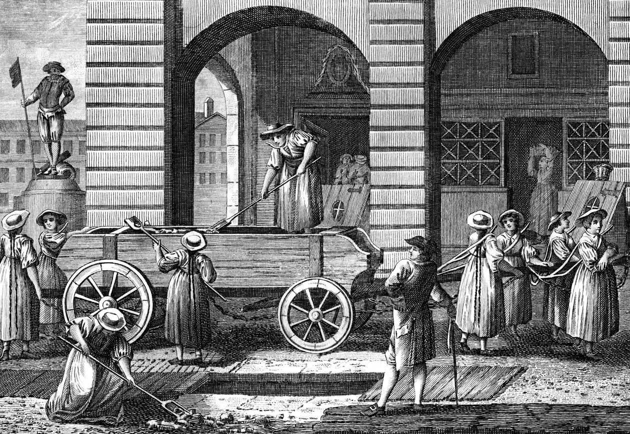 transport · transportation · road · female · women · woman · people · street · country · switzerland · occupation · lane · avenue · swiss · cart · location · century · profession · lady · concept · punishment · shovel · prostitute · shovelling · monochrome · prostitution · road transport · black white · black and white · 18th century · eighteenth century · manure · engraving · unknown · The Print Collector/Heritage Images |