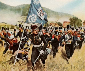 germany · people · rochling · karl · karl rochling · male · historical · german · arts · flag · flags · country · book · color · location · armed forces · century · banner · bohemia · czech republic · soldiers · thirties · literature · concept · battle · advance · standard · army · advancing · warfare · album · colour · 19th century · battlefield · 1930s · prussian · 20th century · nineteenth century · history · historic · cigarette card · napoleonic wars · prussia · prussian army · unknown · cigarette card · war of the sixth coalition · battle of kulm · bilder deutscher geschichte · o.h.w. hadank · hadank · o.h.w. · oskar hermann werner hadank · oskar hermann werner · o h w hadank · o h w · cigaretten-bilderdienst altona-bahrenfeld · altona-bahrenfeld · cigaretten-bilderdienst · cigaretten bi · carl röchling · röchling · carl · rochling · carl · carl roechling · roechling · carl · carl rochling · The Print Collector/Heritage Images