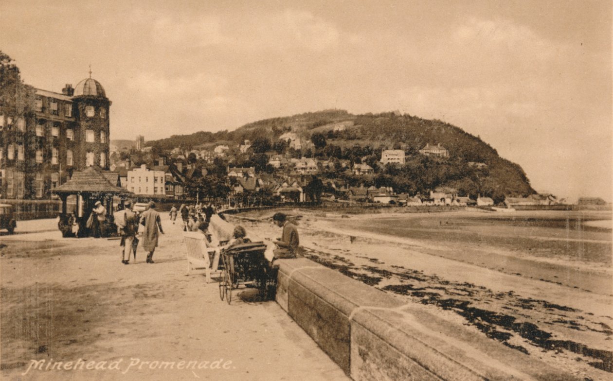 travel · holiday · holidays · building · buildings · england · people · beach · country · resort · seaside · british · geography · english · promenade · location · century · britain · thirties · avon · somerset · seafront · holidaymaker · monochrome · holidaymakers · black white · black and white · 1930s · 20th century · minehead · tourism · tourists · bristol channel · coastal resort · geographical feature · photograph · landscape · postcard · unknown · The Print Collector/Heritage Images |