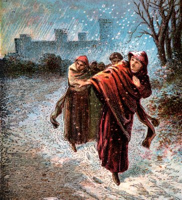 weather · england · season · winter · female · women · woman · people · cold · country · snow · flight · escape · clothes · english · color · colour · royal · medieval · dress · location · century · oxford · oxfordshire · royalty · fleeing · lady · concept · escaping · cloak · wintry · 19th century · mediaeval · empress · middle ages · nineteenth century · matilda · unknown · maud · empress matilda · empress maud · empress maude · maude · The Print Collector/Heritage Images