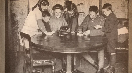 standing · people · child · children · money · finance · table · century · photograph · investment · print · furniture · wartime · concept · investor · monochrome · round table · money box · black white · black and white · 1910s · 20th century · war bond · photograph · unknown · wilson · hw wilson · hw · The Print Collector/Heritage Images