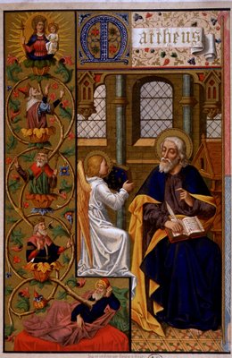 people · male · religious · sitting · arts · religion · symbol · book · color · colour · christian · christianity · saint · century · bible · literature · seated · new testament · disciple · apostle · 19th century · nineteenth century · virgin and child · evangelist · 1st century · st matthew · portrait · unknown · alban · matthew · saint matthew · st matthew the evangelist · alban butler · butler · The Print Collector/Heritage Images