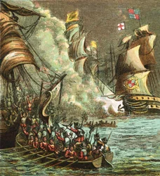 transport · transportation · boat · boats · ship · ships · geography · color · colour · rowing · century · rowing boat · soldiers · soldier · concept · channel · galleon · battle · navy · sailor · warfare · sailors · sailing ship · english channel · naval warfare · 19th century · water transport · 16th century · nineteenth century · sixteenth century · elizabethan · geographical feature · sea battle · spanish armada · armada · queen of england · unknown · queen elizabeth i · elizabeth i · queen elizabeth · elizabeth tudor · francis · sir francis · sir francis drake · drake · francis drake · The Print Collector/Heritage Images