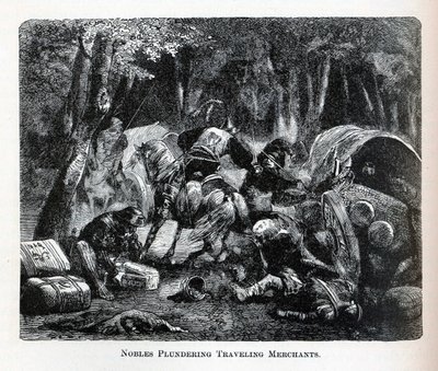 germany · robbery · anonymous · mugging · robber · robbers · feudalism · knights · graphic arts · middle ages · woodcut · history · woodcut · anonymous · book design · private collection · history · highwaymen · pictorial history of the worlds great nations · Fine Art Images/Heritage Images