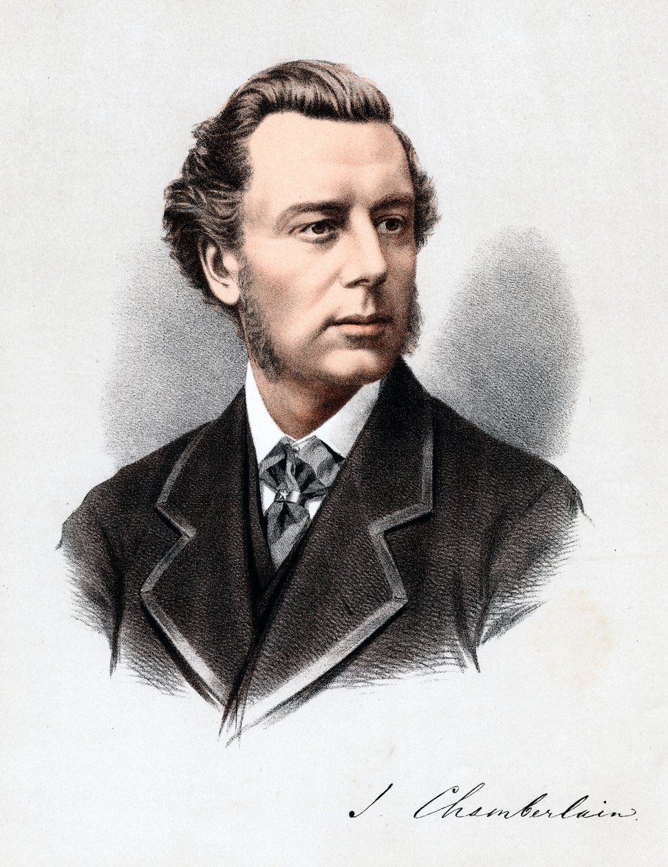 vertical · england · people · male · government · politics · suit · country · british · english · color · colour · dress · location · victorian · century · britain · liberal · politician · minister · 19th century · 1880s · nineteenth century · statesman · ann ronan pictures · liberal party · president of the board of trade · joseph chamberlain · lithograph · portrait · anon · anonymous · joseph · chamberlain · Ann Ronan Picture Library/Heritage-Images