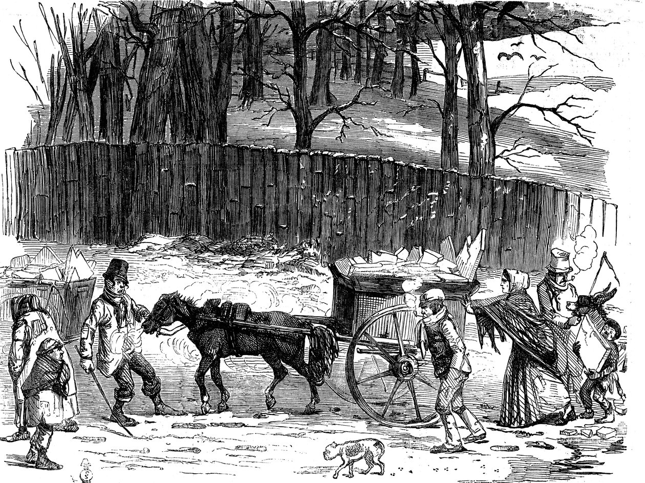 weather · transport · transportation · london · england · season · winter · people · cold · country · snow · british · english · poor · poverty · location · century · britain · concept · monochrome · refrigeration · wintry · road transport · 19th century · black white · black and white · nineteenth century · ann ronan pictures · food preservation · horse and cart · horse-drawn vehicle · ice cart · tgn · wood engraving · unknown · Ann Ronan Picture Library/Heritage-Images |