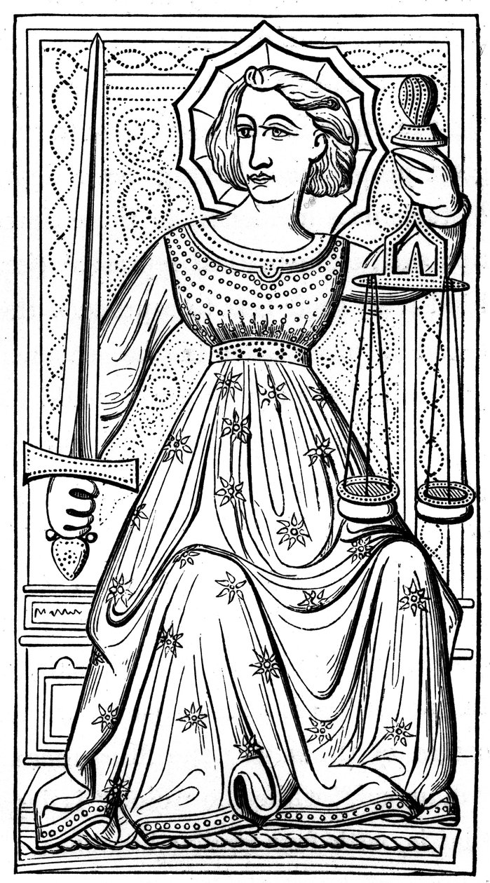 female · women · woman · people · weapon · weapons · balance · scales · medieval · century · justice · sword · swords · lady · concept · prediction · mythology · mythological · monochrome · tarot card · warfare · weighing device · black white · black and white · weaponry · mediaeval · middle ages · 14th century · allegorical figure · fourteenth century · king of france · engraving · unknown · paul · king charles vi · charles vi · paul lacroix · lacroix · jacquemin gringonneur · gringonneur · jacquemin · The Print Collector/Heritage Images |
