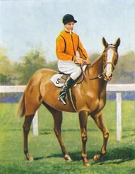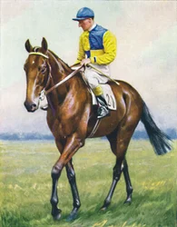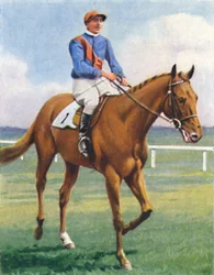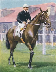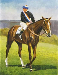portrait · animal · people · male · sport · sports · animals · horses · horse · riding · rider · jockey · orange · grass · headdress · color · colour · purple · dress · century · clothing · thirties · sportsmen · sportsman · horse racing · cosmopolitan · silks · horseback · colt · headgear · number 1 · thoroughbred · racetrack · racehorse · 1930s · orange colour · 20th century · king of great britain · horse-racing · unknown · saxe-coburg-gotha · albert frederick arthur george · duke of york · king george vi · george vi · albert frederick arthur george saxe-coburg-gotha · cigarette card · jackie · wd ho wills · wills · wd ho · wd and ho wills · hm king george vi · chestnut brown · ill fated · royal colours · royal jockey · jackie crouch · crouch · The Print Collector/Heritage Images