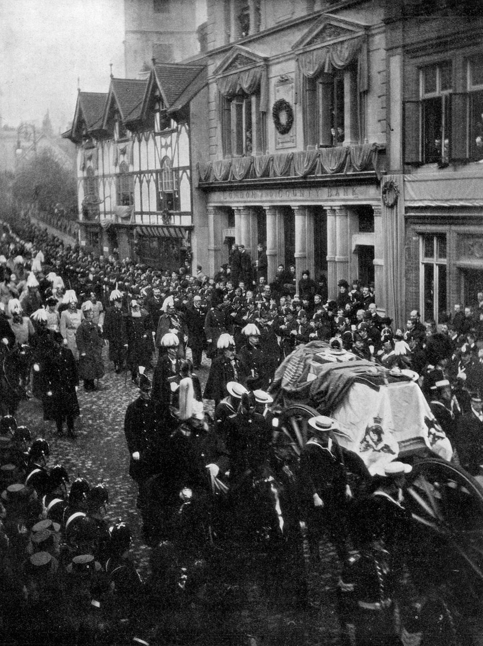 road · building · buildings · england · people · crowds · street · country · watching · british · english · lane · death · avenue · location · berkshire · century · windsor · britain · sadness · soldiers · soldier · concept · grief · mourning · coffin · monochrome · funeral · black white · black and white · 1910s · 20th century · funeral procession · mourner · gun carriage · paying respects · photograph · unknown · queen of great britain and ireland · queen victoria · victoria · The Print Collector/Heritage Images |