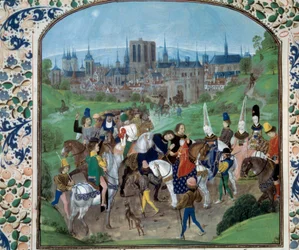 Louis II of Anjou and Yolande of Aragon greet Charles VII(Louis II of Anjou and Yolande of Aragon greet the one who will become their son-in-law, then Charles VII. In the background; the city of Paris. Miniature in “” Chronicles”” by Jean Froissart (Folio 321v))Unknown artist |