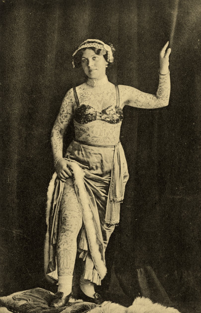 circus · female · women · image · tattooed · european · tattoo · photographic · inked · human exhibit · side show · photography · portrait · woman · vintage · photo · tattoos · photograph · tattooing · maud · freak show · german · performer · Private Collection / Bridgeman Images |