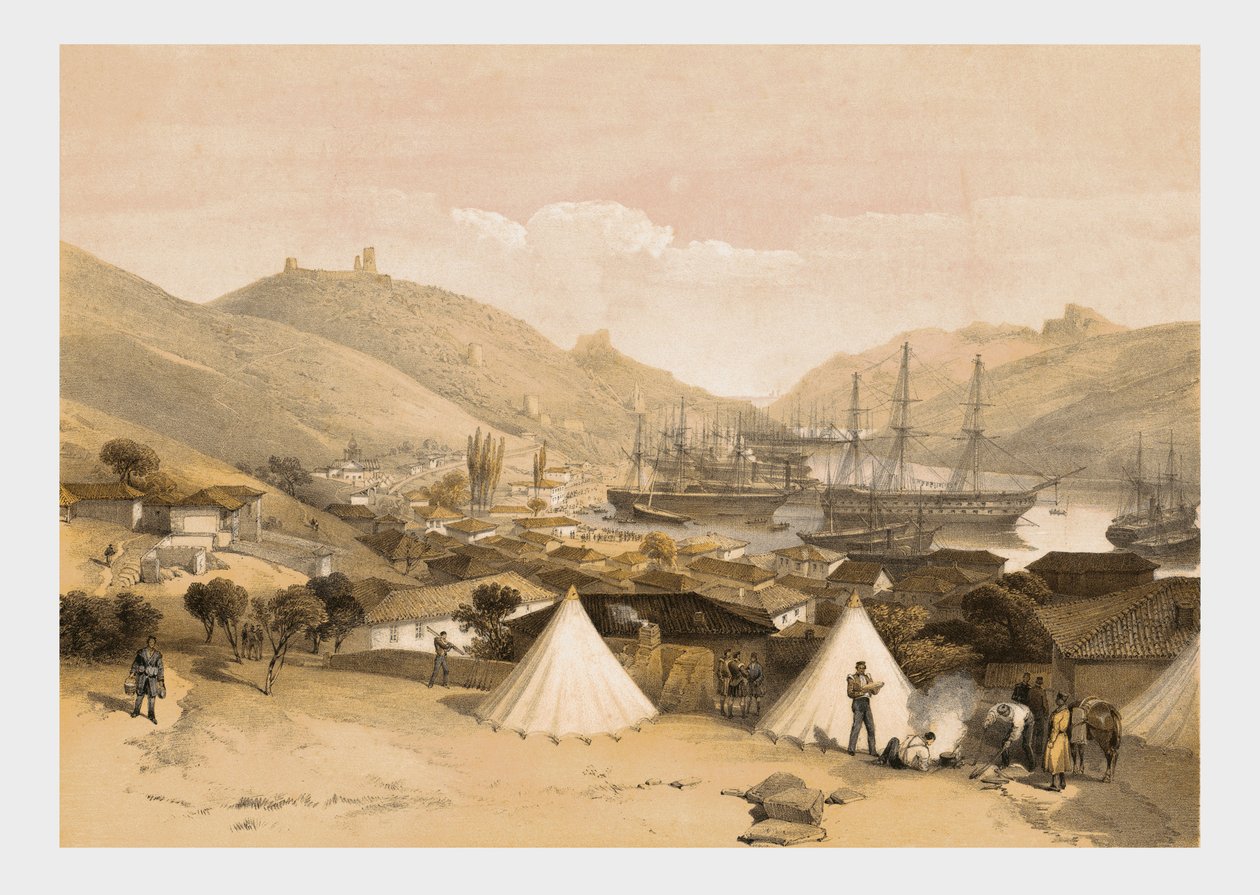 transport · transportation · people · male · country · harbour · ship · ships · british · color · colour · ukraine · tent · tents · location · century · camp · russia · britain · soldiers · soldier · concept · 19th century · water transport · nineteenth century · balaklava · crimea · william simpson · engraving · lithograph · landscape · crimean war · w walton · wl walton · walton · w · simpson · william · The Print Collector/Heritage Images