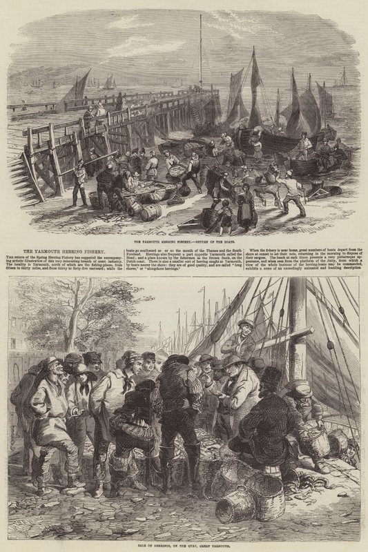 yarmouth herring fishery · return · boats · sale · herrings · quay · great yarmouth · fishing · industry · norfolk · fishing boats · baskets · Private Collection / Bridgeman Images · / Look and Learn |