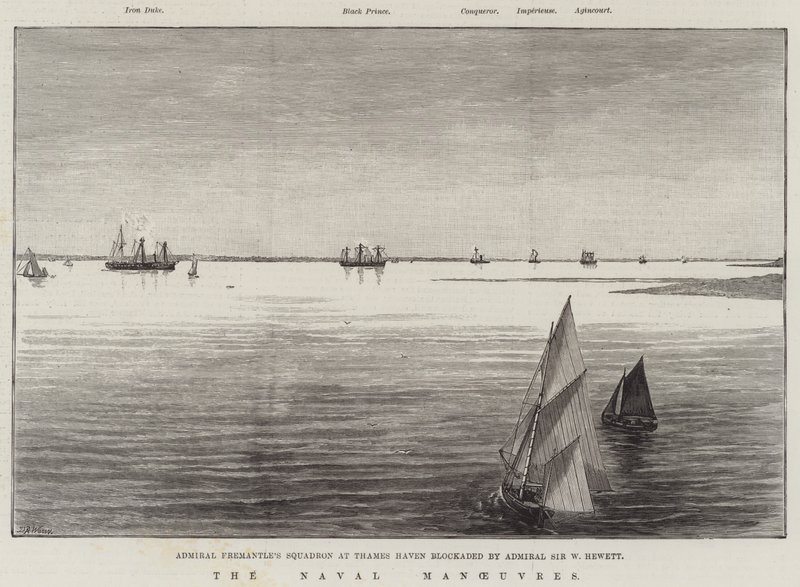 naval manoeuvres · admiral fremantles squadron · thames haven · blockaded · admiral sir w hewett · iron duke · black prince · conqueror · imperieuse · agincourt · river thames · royal navy · ships · maritime · Private Collection / Bridgeman Images · / Look and Learn |