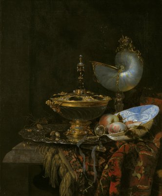 Pronk Still Life with Holbein Bowl, Nautilus Cup, Glass Goblet and Fruit DishWillem Kalf |