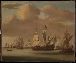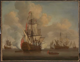 17th century · weapon · army · baroque (art) · art movement · boat · transport · cannon · colour · flag · flemish art · smoke · united kingdom · europe · navy · ship · netherlands · painting · barque · sailing boat · oil painting · mzpainting · · National Maritime Museum, London, UK / Bridgeman Images