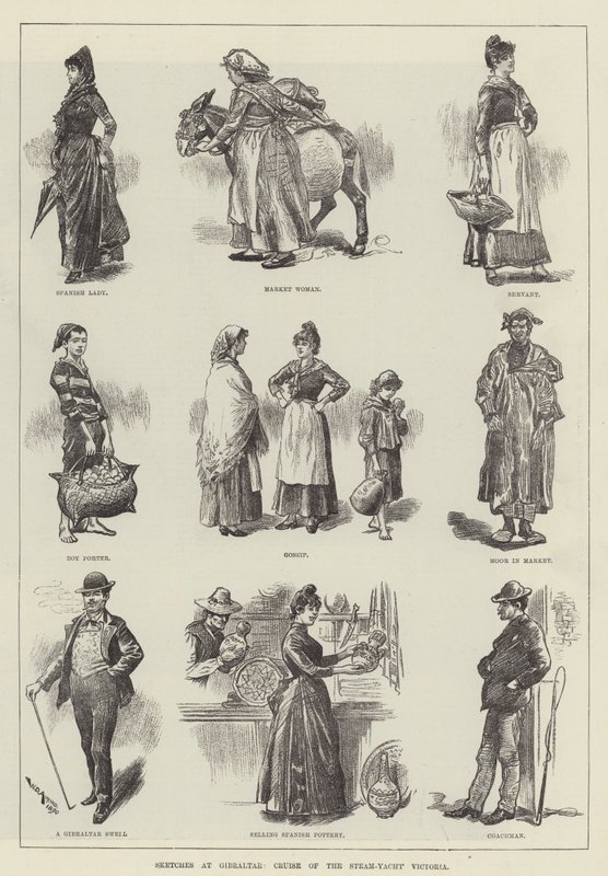 sketches · gibraltar · cruise · steam yacht victoria · spanish lady · market woman · servant · boy porter · gossip · moor · market · gibraltar swell · selling · spanish pottery · coachman · spain · fashions · clothing · traditional dress · professions · Private Collection / Bridgeman Images · / Look and Learn |