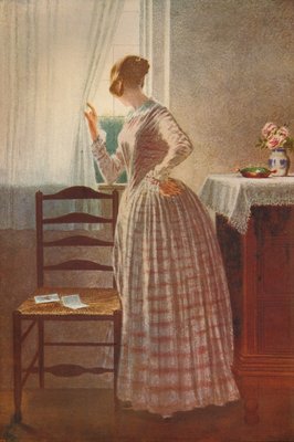 standing · female · women · woman · people · looking · waiting · love · arts · pink · window · book · rose · british · color · colour · dress · chair · victorian · century · britain · hairstyle · furniture · literature · lady · concept · hand on hip · one person · pastel · posture · hairdo · love letter · hairdressing · parlour · 19th century · looking through · 1910s · 20th century · nineteenth century · oil on canvas · portrait · alfred · virtue and company · william henry hunt · hunt · william henry · international art past and present · virtue co ltd · virtue company · alfred yockney · yockney · loves missive · The Print Collector/Heritage Images