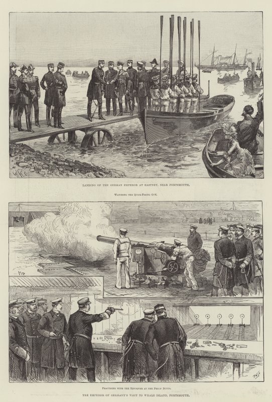 visit · german emperor · landing · eastney · portsmouth · emperor of germany · whale island · watching · quick firing gun · practising · revolver · proof butts · royalty · royal visits · hampshire · weapons · wilhelm ii of germany · Private Collection / Bridgeman Images · / Look and Learn |
