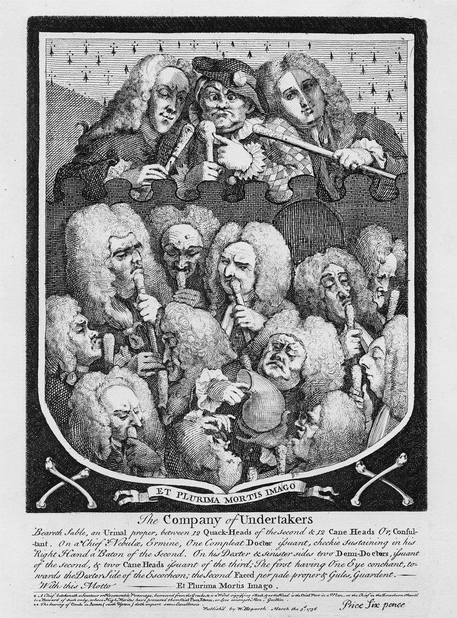 male · caricature · c18th · physician · doctor · quacks · quack · wigs · untrustworthy · death · cross bones · satire · satirical · medicine · dangerous · crowd · humour · humorous · medical practitioners · Private Collection / Bridgeman Images
