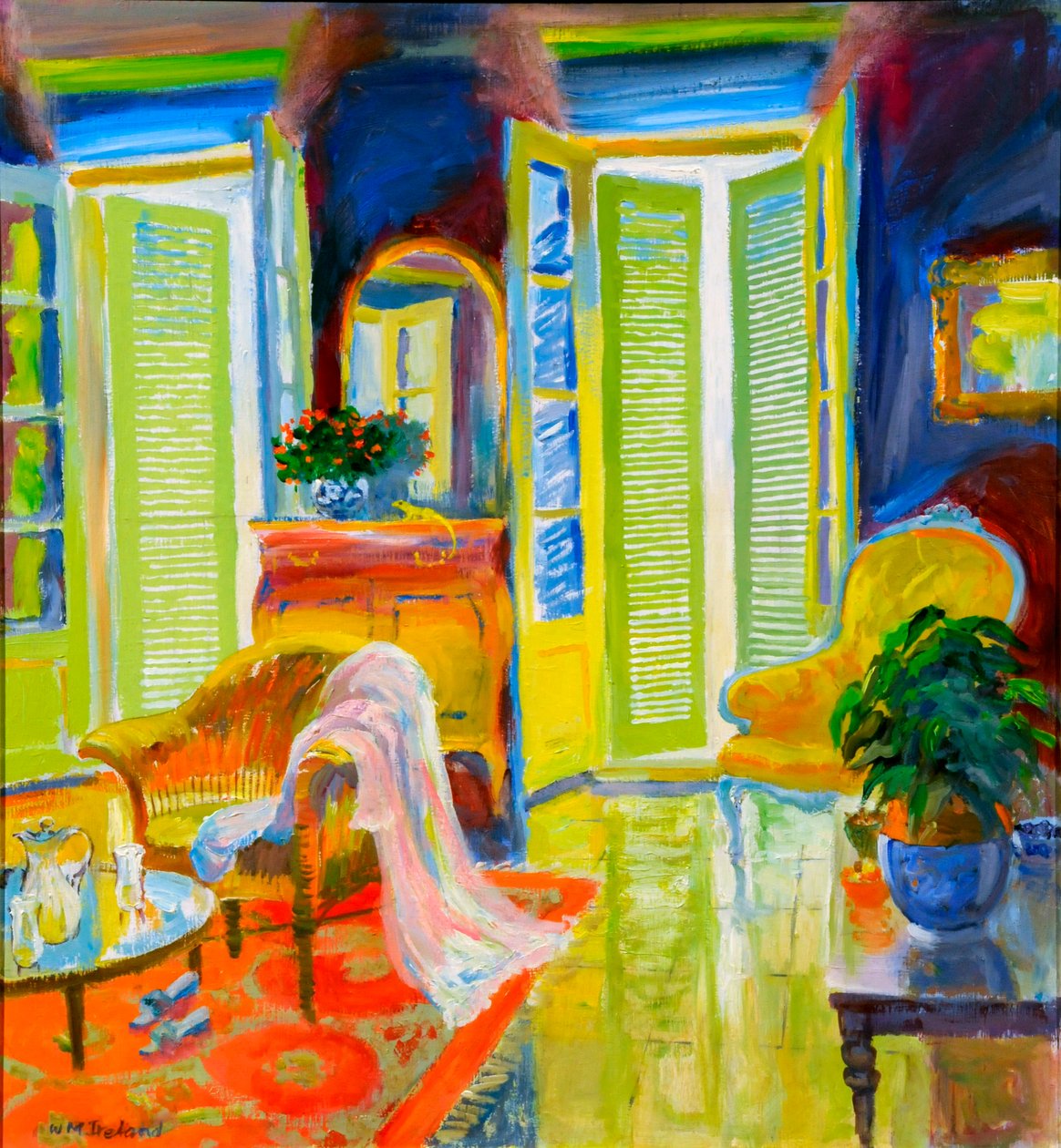 interior · wicker chair · bedroom · french windows · pot plant · mirror · colourful · painting · watercolour · Private Collection / Bridgeman Images
