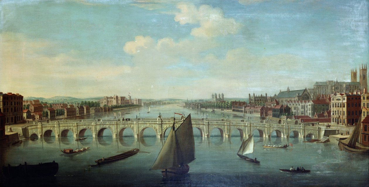 westminster bridge · westminster hall · westminster abbey · thames · london · lambeth palace · suffolk house · view · river · boats · sailing boats · commmerce · transportation · transport · c18th · city · river thames · cityscape · architecture · arches · houses · civil engineering · Private Collection / Bridgeman Images